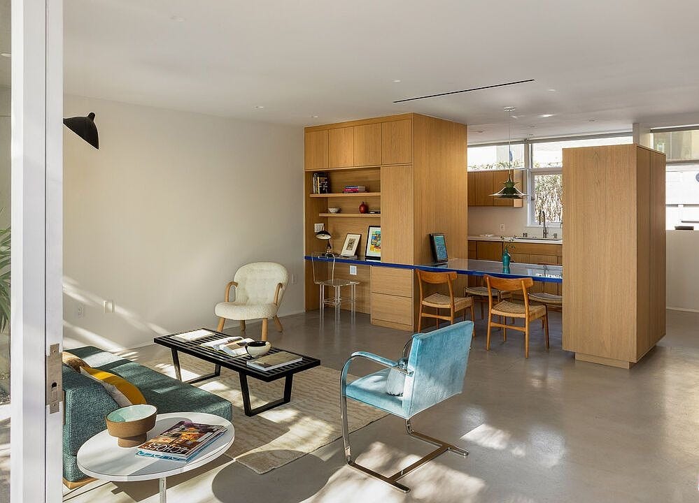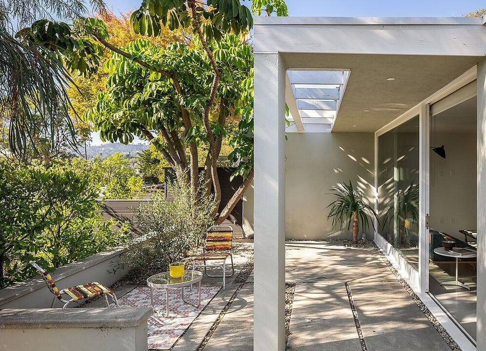 Yesterday, a midcentury designed by Gregory Ain, a slightly lesser-known but no less revered member of that vaunted group, hit the market in Silver Lake. It’s actually not a single-family residence, but part of the Avenel Homes, a collection of ten identical cooperative units built in 1947 and added to the National Register of Historic Places in 2005. The single-level units are arranged in a sawtooth pattern, so each has an entrance from the outside and a private rear patio. Like each of the nine others, this unit features three bedrooms, one bathroom, and Ain’s famous sliding walls, which can be used to separate or combine living spaces as the occupant sees fit.